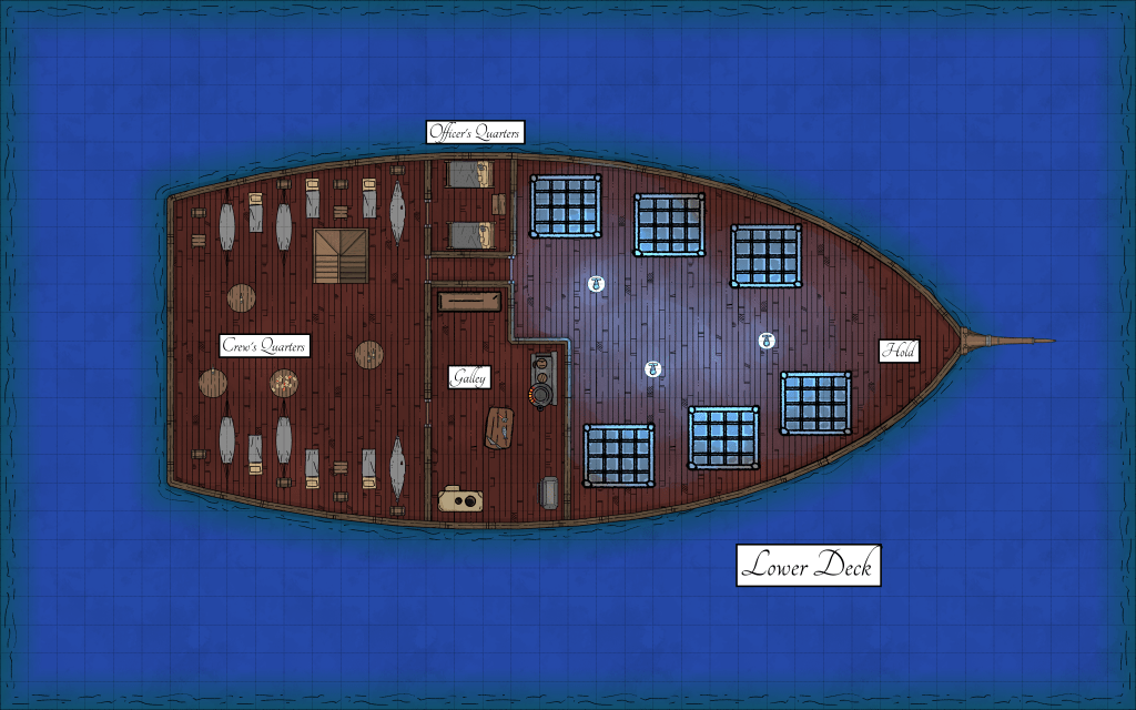 Crew’s Quarters: Small wooden cots and ripped rope hammocks line the walls of the crew’s quarters. Small chests of drawers sit at regular intervals along with tiny tables with various objects on them such as dirty playing cards, chipped dice, and empty mugs. There are three doors on the far wall.