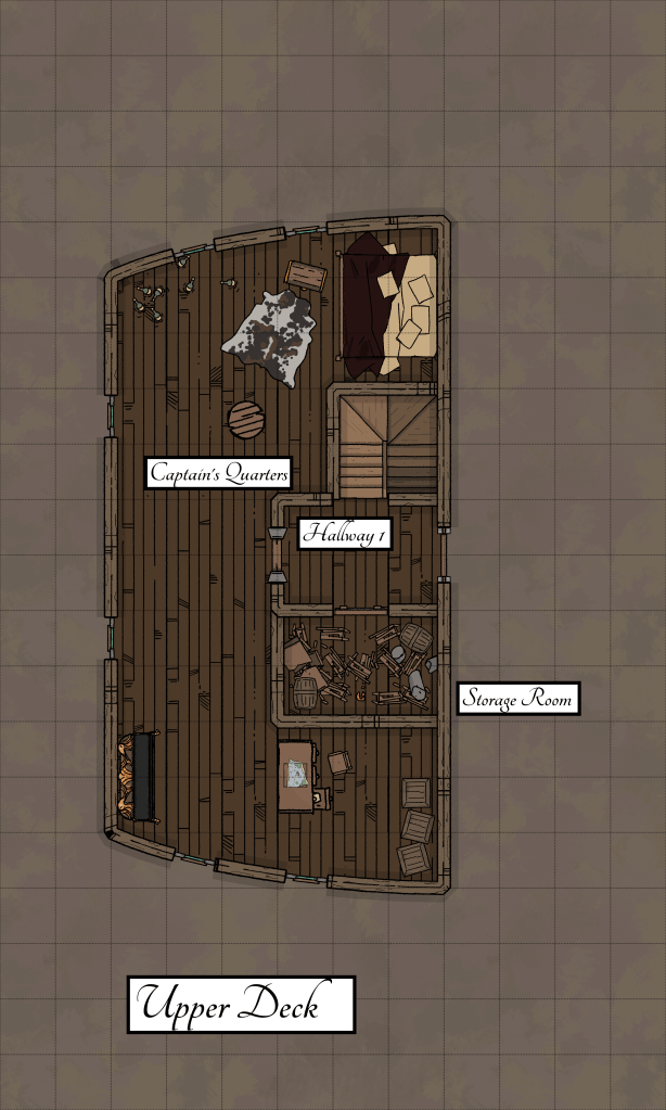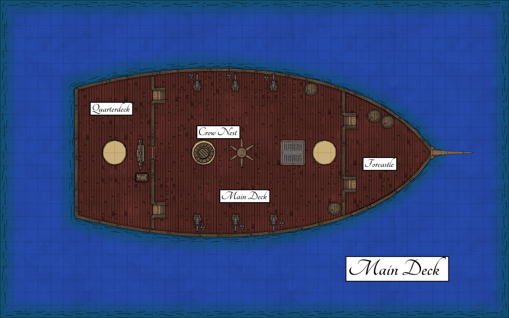 There are always 4-6 ghostly crew members found on the main deck usually engaged in the standard tasks they once performed in life such as mopping the deck, managing the sails, and cleaning the cannons even though none of these tasks are needed to maintain the ghost ship anymore. The cannons are rusted and the powder useless. A character proficient in alchemy or some form of machinery may repair the cannons in about twenty minutes with a successful Intelligence DC 15 check. The door leads to hallway 1 on the upper deck.