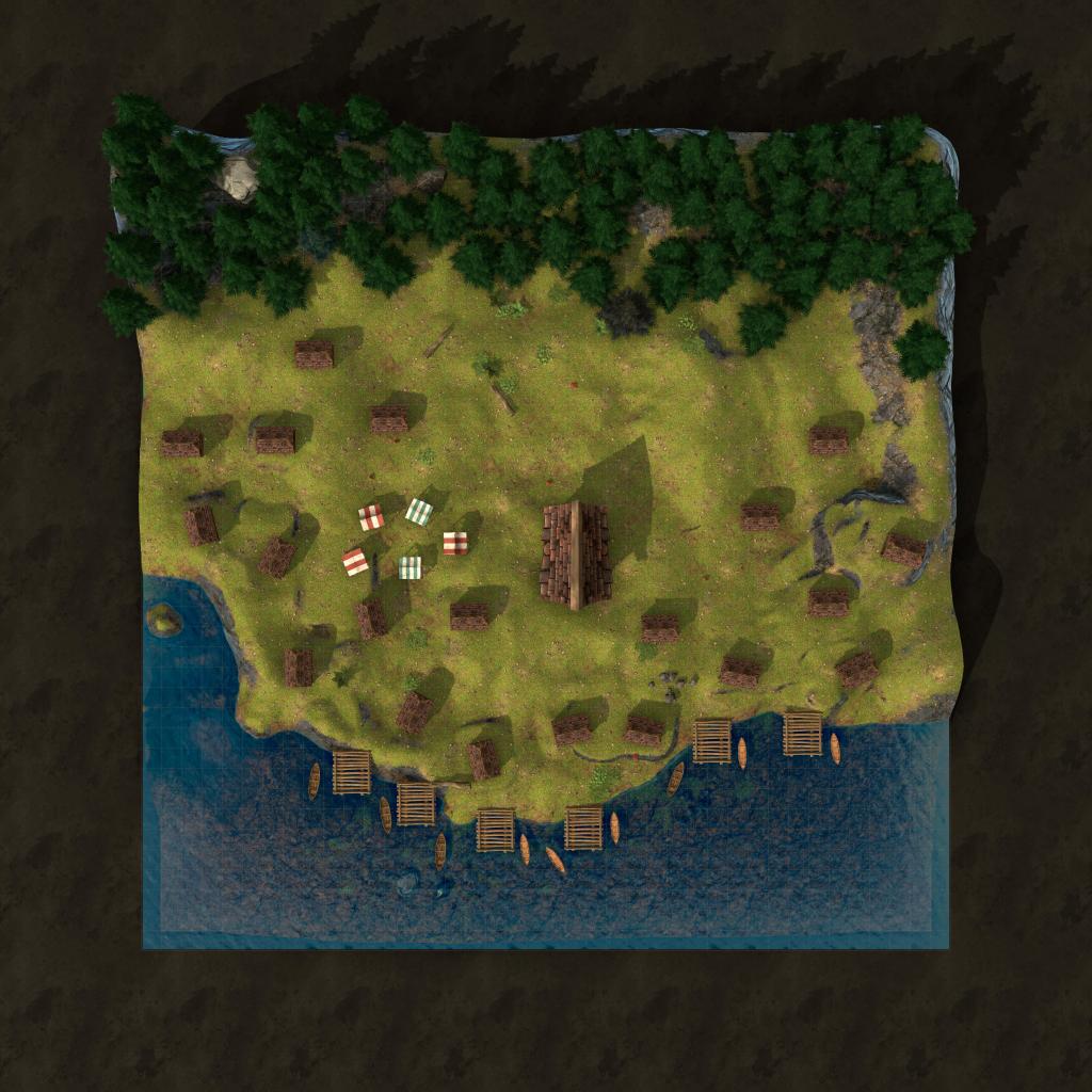 The Docks: The docks include about thirty small fishing boats that can carry maybe 3-4 people. The docks will be empty. The water is too shallow for the big pirate ship to dock so it will weigh anchor about 200 yards from shore and send four long boats each carrying eight pirates to stealthily pull ashore and attack the village.